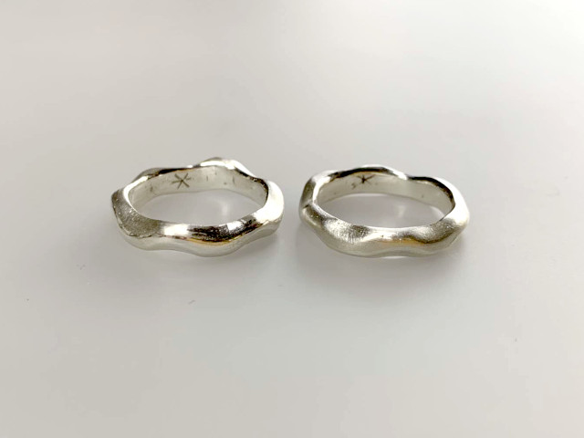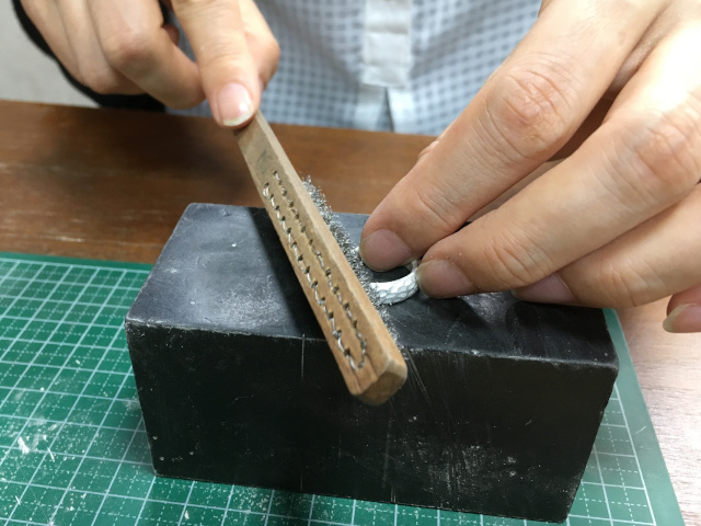 基本体験では、ワイヤーブラシによるマット仕上げ(一部鏡面仕上げ可)になります。リング、ペンダントトップとも、全体の鏡面(ピカピカ)仕上げは、0.5時間~1時間の追加が必要です。