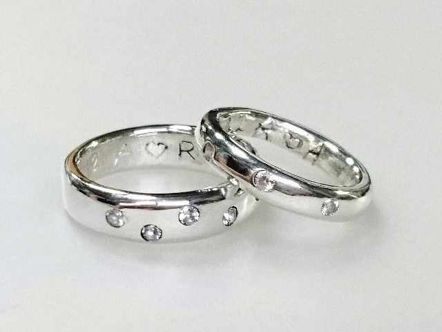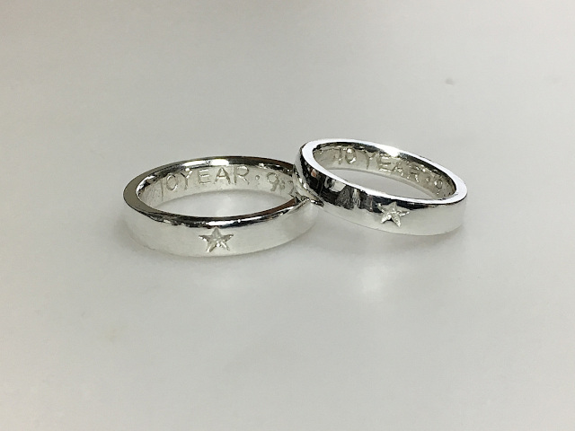 これまでペアリングを作られた方の作品例。基本の体験2.5時間で作られたものから、文字や模様彫り・石を入れて鏡面仕上げにしたもの、予め二人だけのオリジナルデザインを考えてきたこだわりのリングまでラインナップ。