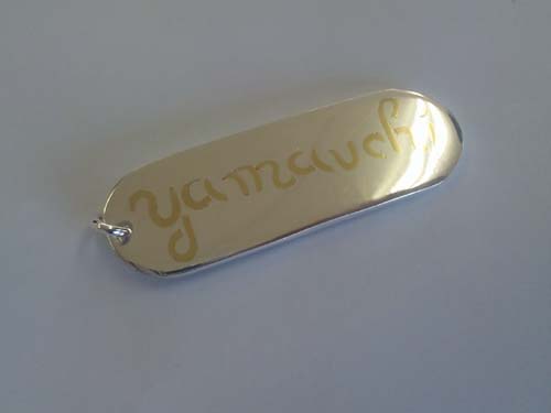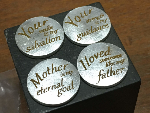 板材から簡単な形を切り出し、ヤスリなどで整えた後イニシャルなどを刻印します。