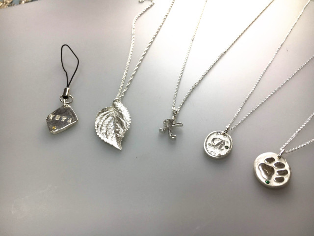 アートクレイ(銀粘土)を使った4つのコースの基本体験料金には、2.5時間の基本受講費と基本材料費が含まれます。作品により、追加の材料費や受講費が必要になる場合があります。開始前の作品プラン決めの際にご確認下さい。※チェーン、石:別途要