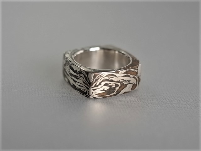 銀粘土&銅粘土の組み合わせで、地金からでは難しい表現も可能なのが魅力。伝統技法の木目金の模様を手軽に出来る新しい技法です。